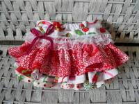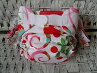 This nappy has an outer of cotton, a hidden layer of PUL and an inner of suedecloth to keep moisture away from little bottoms. The detachable ruffles are 100% cotton with ribbon detail, and attach to the rear of the nappy with 4 resin snaps.