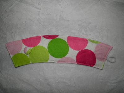 They are made from a patterned cotton outer and a coordinating plain cotton inner with a middle layer of heatproof wadding. The cuffs are secured with a fabric covered button and an elastic loop to make for a better fit, and will work best with a regular to large sized coffee.