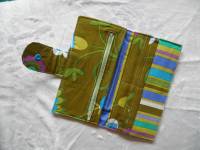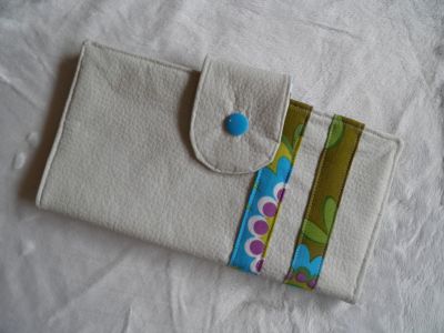 These handmade wallets have an outer layer of white vinyl for sturdiness but the inside is 100% cotton. Each has 6 card slots and a zippered pocket as well as two full width pockets.