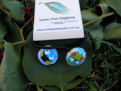Hair elastics are 55cm diameter, buttons are 19mm and covered with blue owl fabric