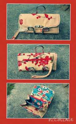 The wrist strap is removable, and the wallet is secured by a twist lock closure.